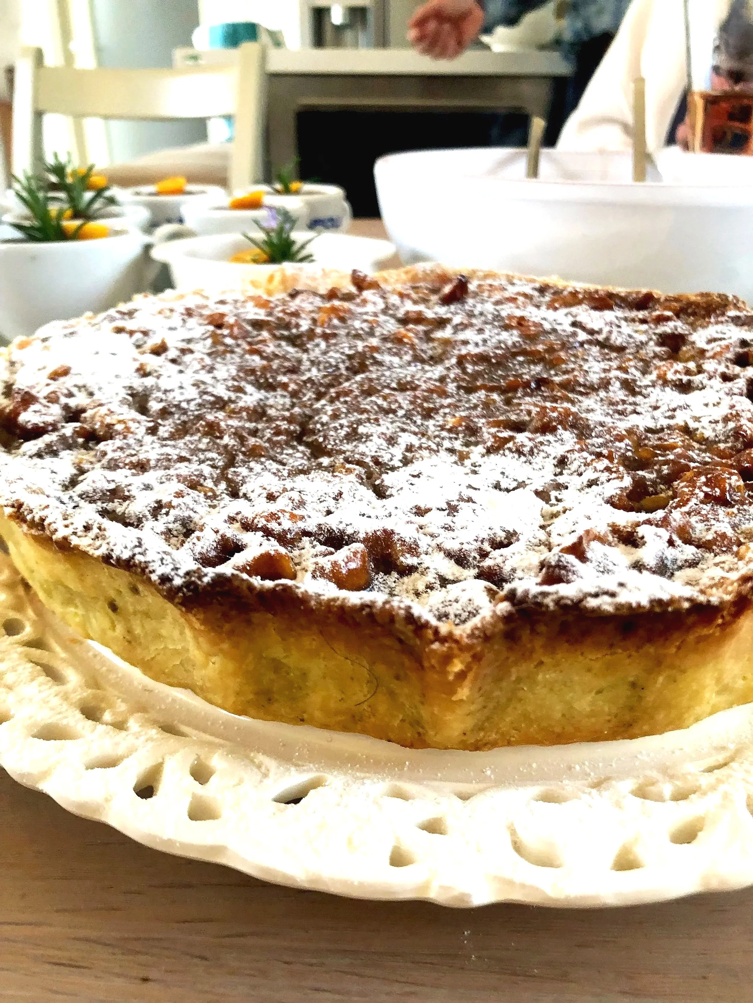 An old favourite (I first published the recipe in 1991) that I have recently revived to the considerable approval of those gathered around the table. It’s rich and sticky and a little oozy in the centre, packed to the hilt with nuts. Serve just as it is, with cream or with icecream, or with something fruity to cut through the decadence. I partnered it with pears poached in a light syrup when we last ate it. Excellent.